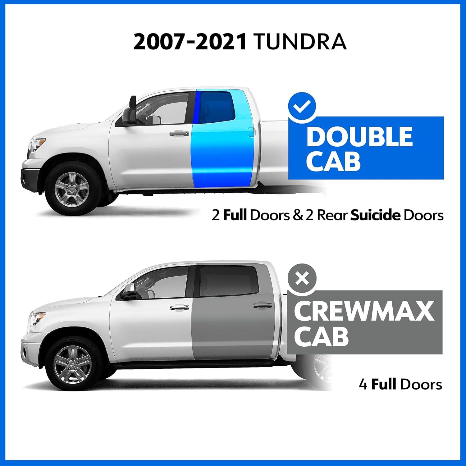 FITMENT – {{ Enter the LICENSE PLATE in the Amazon Confirmed Fit tool at the top of this page to confirm your vehicle fitment with this product. }} Compatible with 2007-2021 Toyota Tundra | Double Cab [Cab Size Note: Only fit Double Cab with 2 full-size front doors & 2 narrower rear doors. NOT for CrewMax Cab with 4 full-size doors. (See Image for more info)]
