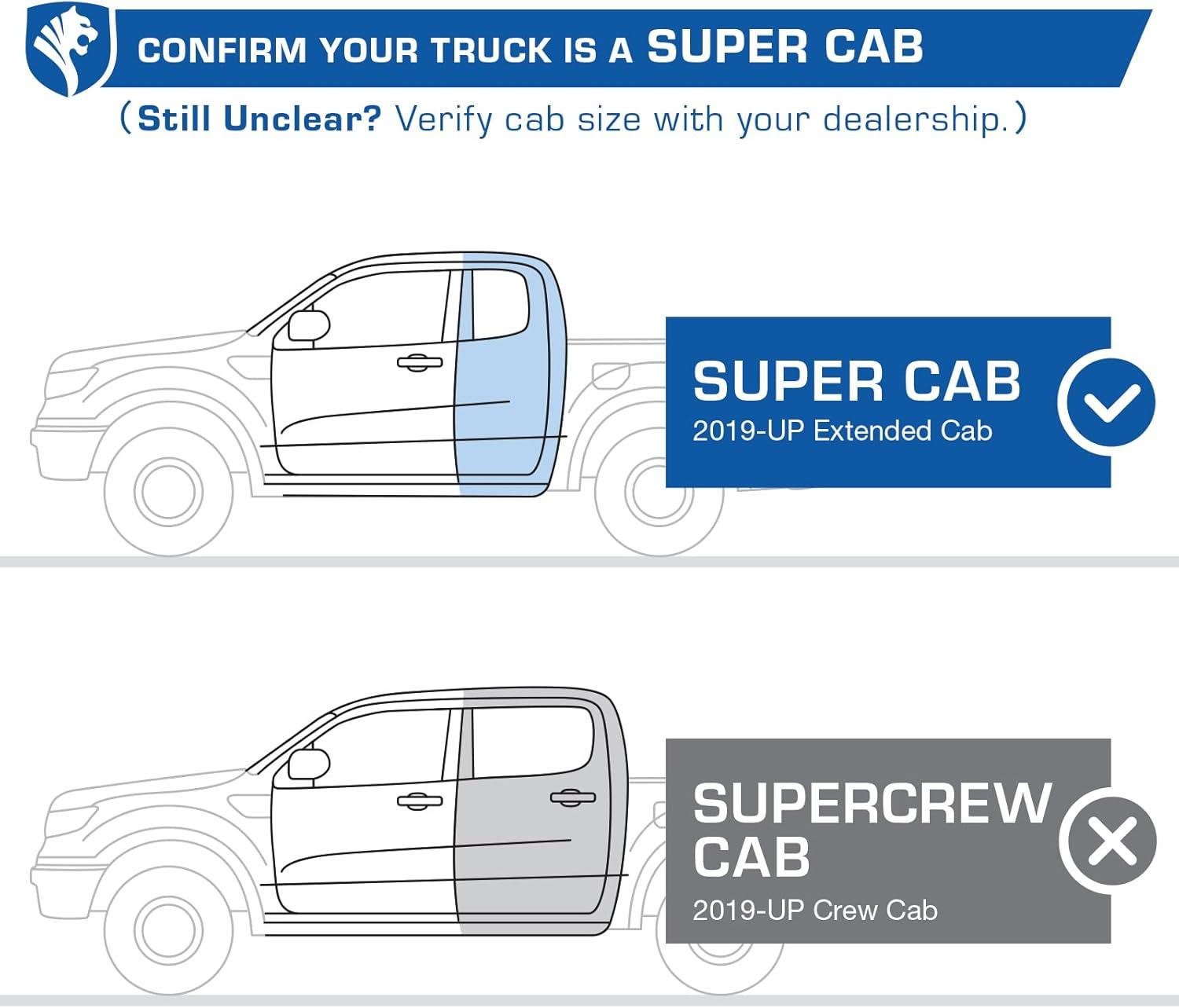 FITMENT – {{ Enter the LICENSE PLATE in the Amazon Confirmed Fit tool at the top of this page to confirm your vehicle fitment with this product. }} Compatible with 2019-2023 Ford Ranger | Supercab [Cab Size Note: Only fit SuperCab with 2 full-size front doors & 2 suicided rear doors. NOT for SuperCrew. (See Image for more info)]