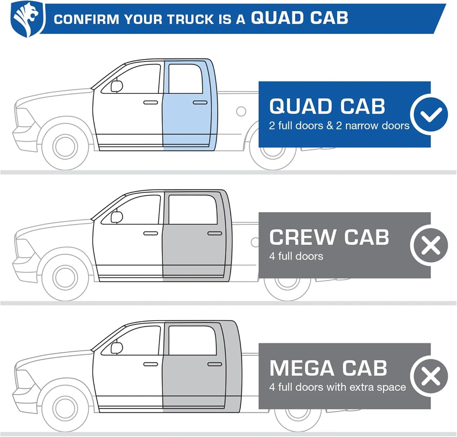 FITMENT – {{ Enter the LICENSE PLATE in the Amazon Confirmed Fit tool at the top of this page to confirm your vehicle fitment with this product. }} Compatible with 2019-2026 Ram 1500 | Quad Cab [Cab Size Note: Only fit Quad Cabs with 2 full-size front doors & 2 narrower rear doors. NOT for Crew Cab or Mega Cab. (See Image for more info)] | Not compatible for 2019-2024 Ram 1500 Classic