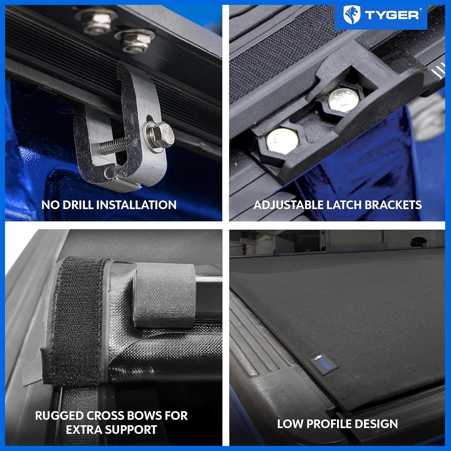PREMIUM OUTDOOR FABRIC – For truck owners who appreciate rugged gear and outdoor-grade materials, the Tyger Auto T2X Soft Roll-up Tonneau Cover in Fabric delivers both style and performance. Featuring a premium 1200D Oxford fabric tarp with a heavy-duty PVC coating, the T2X offers a high-end, fabric-textured look with true waterproof protection to handle all types of weather conditions. T2X's sleek, low-profile design keeps your truck looking sharp while preserving full use of the bed rail surface and stake pockets for mounting racks, rails, and other truck bed accessories. Velcro strips along the sides create a weather-tight seal, and the tailgate latch system locks the cover securely in place. The integrated tension control system at the rail ends ensures a tight, wrinkle-free fit all year round. Quick-release latches let you roll up the cover easily for full bed access, and installation is fast and drill-free. Like all Tyger Auto covers, the T2X is backed by our limited lifetime warranty and engineered to meet or exceed OE standards for truck owners who demand more from their gear.