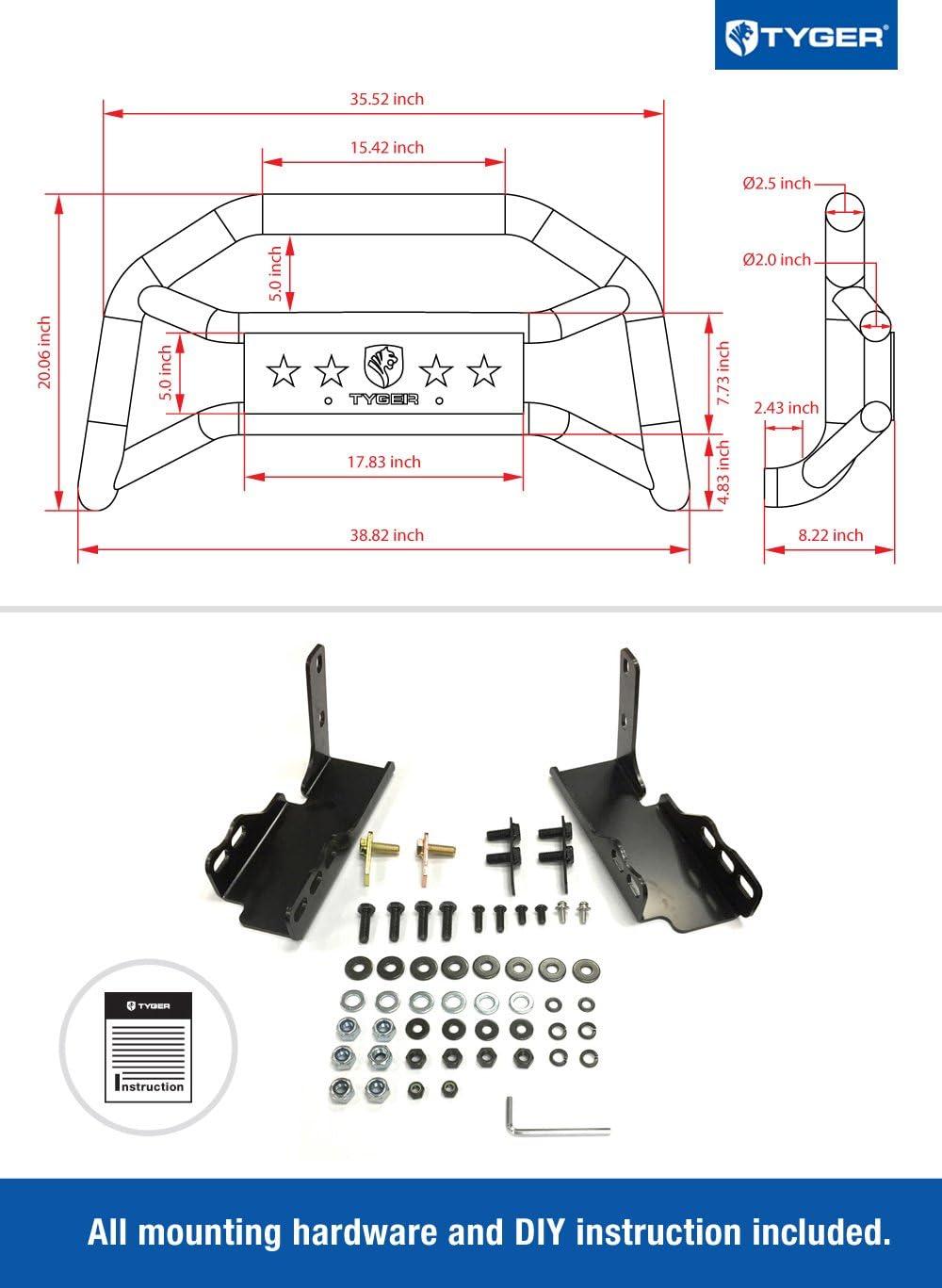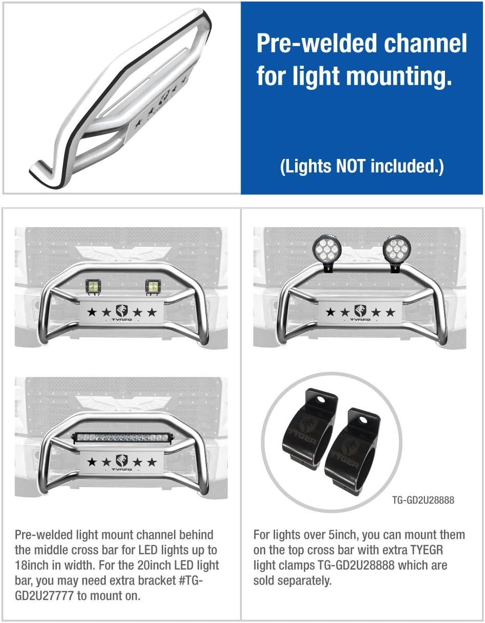TYGER AUTO patented bumper guard will give your vehicle a tough protection on front end and make your vehicle stand out on the street ! Pre-welded light mount channel for optional LED light mounts and two pre-drilled mounting holes for license plate relocation if needed.